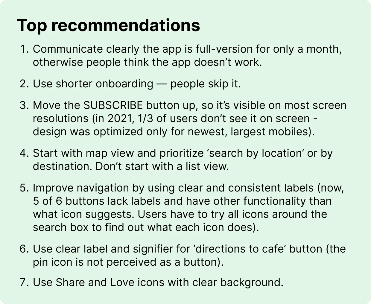 Sharing and directions are part of the core user story. Visibility issues and weak affordances caused users to fail at sharing locations or getting directions, forcing manual workarounds.