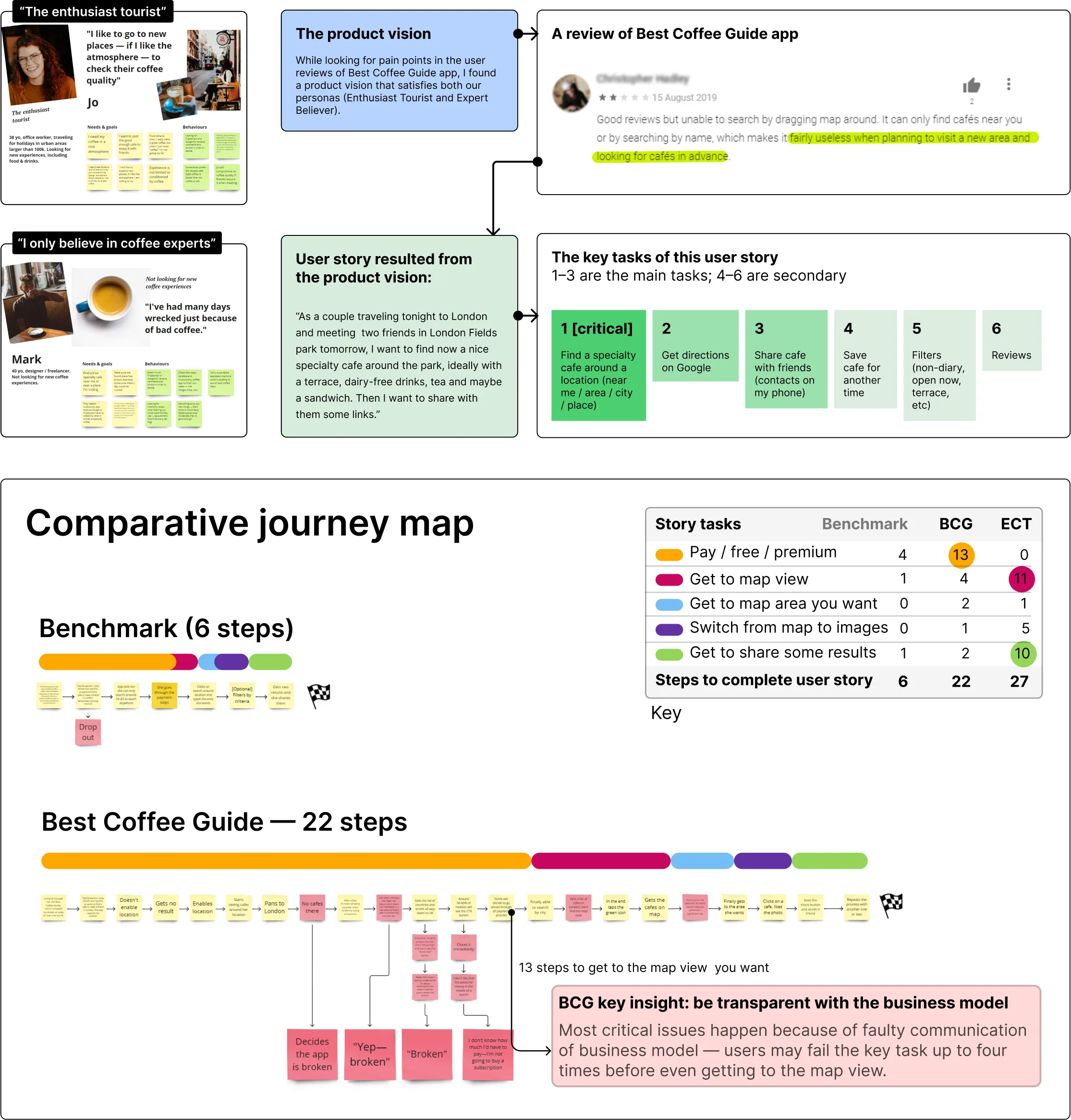 Comparative journey map of main user story, highlighting top pain points