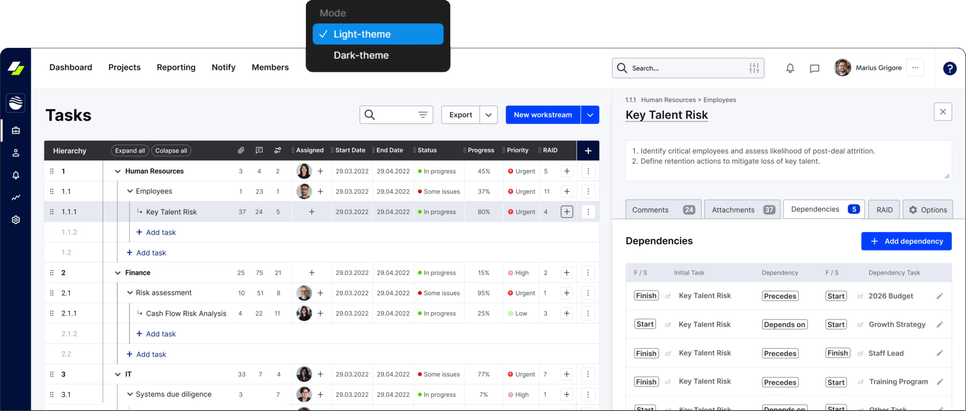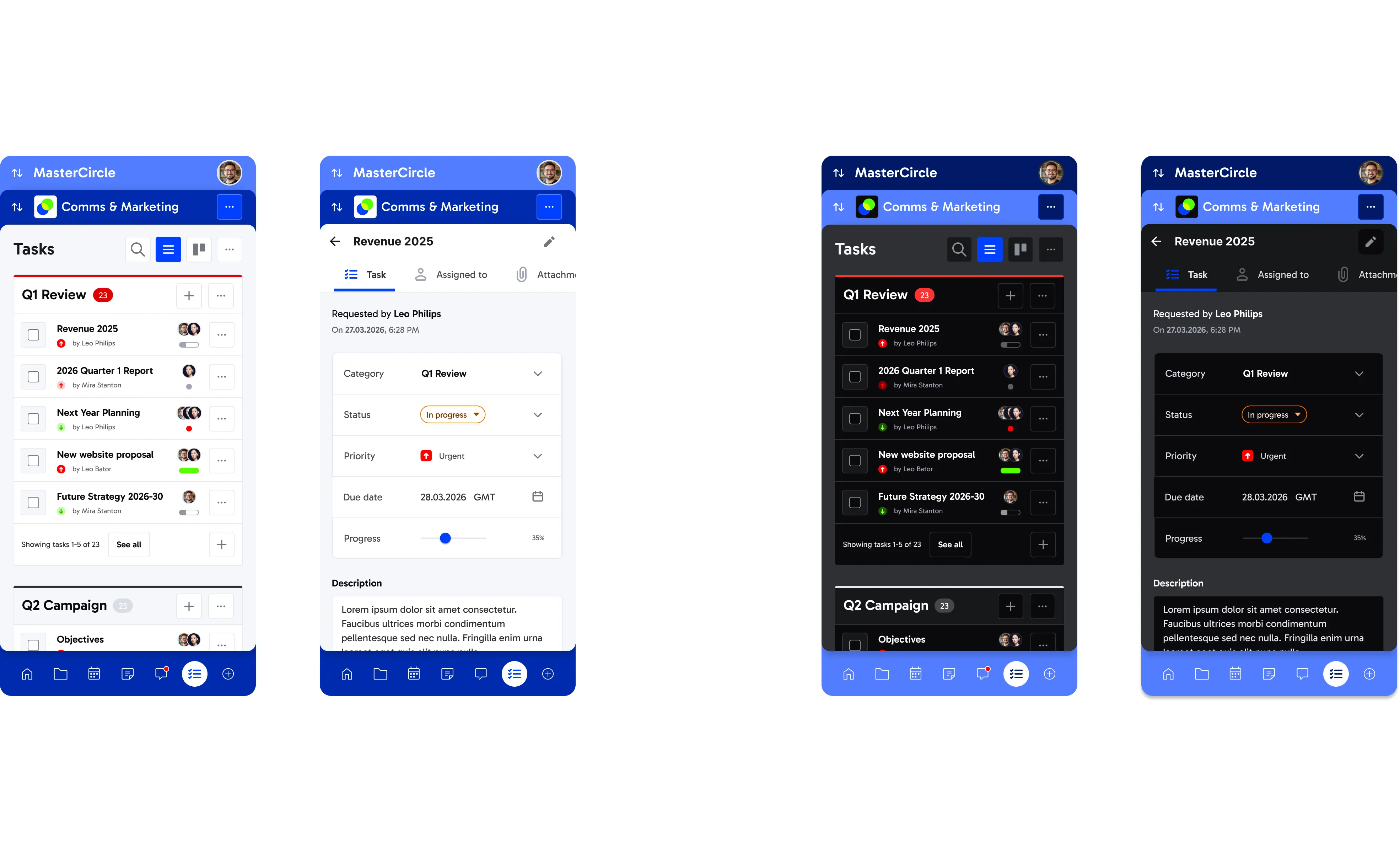 Improved 'Tasks' feature and 'Task Options'. Based on re-usable components. Light / dark mode based on semantic tokens.