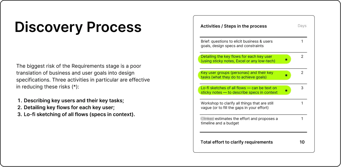 Introduces a structured, time-boxed Discovery process expressed in days, making effort and cost explicit and predictable.
