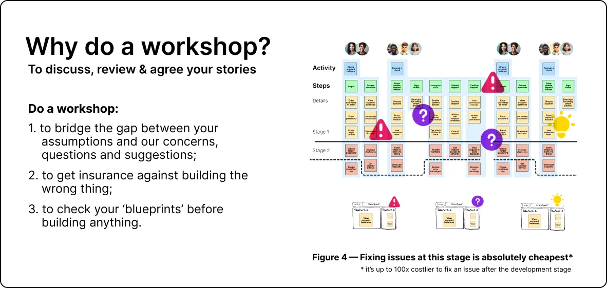 Validates assumptions and blueprints with stakeholders before development begins, reducing the risk of building the wrong thing.
