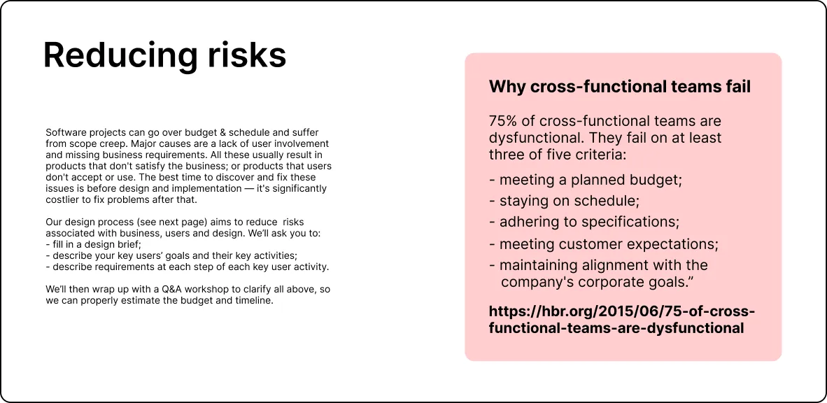 I designed a structured discovery presentation and workshop, with the purpose to eliminate the time we spent on discovery efforts without payment or a signed agreement. It's a DIY-requirements tutorial for prospects, with the option to 'buy' our Discovery Workshops.